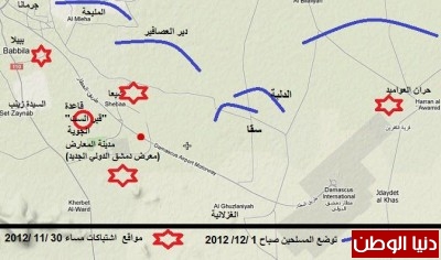 كما وجرى إبعادهم من المناطق الواقعة في الجهة الشرقية من المطار، إلا أن الآلاف منهم لا يزالون يسيطيرون على التجمعات السكانية الواقعة في منطقة"دير العصافير" و"شبعا" وأطراف "الدلبة" و"سقا" من الجهة الشمالية، والأطراف الشرقية من "حران العواميد". ( انظر الخارطة لمعرفة توضع المسلحين صباح اليوم السبت).
