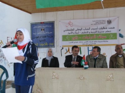 بدوره رحب الحواش بالحضور , مؤكداً على أن هذا اليوم يضاف إلى أيام و أفراح فلسطين بإعلان الدولة الفلسطينية و بحصول فلسطين على عضوية الأمم المتحدة , و مهنئاً الشعب الفلسطيني و القيادة الفلسطينية بهذه المناسبة .و مشيراً إلى أن فعالية اليوم أيضا تندرج ضمن فعاليات أسبوع الشباب الفلسطيني و التي تنفذها