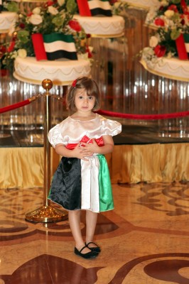 رسمت الطفلة الفلسطينية ملك حماد فرحة الطفولة باليوم الوطني للامارات , حينما ارتدت زيها المطرز بالعلم الاماراتي وشاركت في البرنامج الاحتفالي الذي يقيمه قصر الامارات حتي نهاية الاسبوع الجاري .