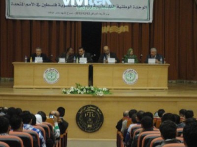 وفي سياق الندوة تحدث الدكتور مصطفى البرغوثي امين عام حركة المبادرة الوطنية الفلسطينية ان تصويت على عضوية فلسطين غير الكاملة في الجمعية العمومية في الامم المتحدة, يعد شهادة ميلاد رسمية لولادة دولة فلسطين والانتصار الفلسطيني الثاني خلال اسبوع, والهزيمة الثانية لاسرائيل في ذات الفترة. ثم تطرق البرغوثي الى العزلة الدولية لاسرائيل على الساحة الدولية نتيجة سياساتها الاحتلالية و نهجها المستمر في سياسة التوسع الاستيطاني على الاراضي الفلسطينية ومحاولتها فرض واقع على الارض. كما واوضح الدكتور البرغوثي ان الخطوة الاهم الان بعد الانتصار التاريخي والهام بالامم المتحدة هي التوجه الفعال والسريع نحو المصالحة الوطنية الفلسطينية وانهاء الانقسام وتشكيل قيادة وطنية موحدة وتفعيل المقاطعة للمنتجات الإسرائيلية.