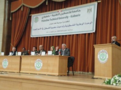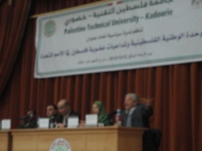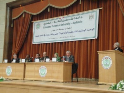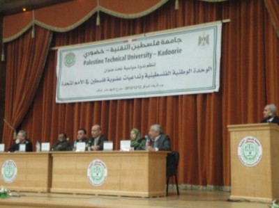 نظمت جامعة فلسطين التقنية – خضوري ، اليوم الأربعاء ، ندوة سياسية بعنوان " الوحدة الوطنية الفلسطينية وتداعيات عضوية فلسطين بالامم المتحدة " بمشاركة اللواء محمود العالول– عضو اللجنة المركزية لحركة فتح والدكتور مصطفى البرغوثي امين عام حركة المبادرة الوطنية الفلسطينية ، وذلك بحضور القائم بأعمال رئيس جامعة خضوري الدكتور سائد ملاك،و محافظ محافظة طولكرم السيد جمال سعيد،، ورئيس جمعية أصدقاء خضوري الخيرية الدكتور سليمان الخليل ود.سهام ثابت – عضو المجلس التشريعي، وامين سر اقليم حركة فتح بطولكرم السيد مؤيد شعبان، وحشد كبير من مدراء المؤسسات الحكومية والأهلية وغير الأهلية وكادر الجامعة الأكاديمي والإداري وجمهور غفير من طلبة الجامعة امتلأت بهم مدرجات مسرح الشهيد ياسر عرفات، حيث تولى عرافة حفل التكريم ا. رشيد الراميني مدير دائرة الدراسات والتنمية المجتمعية في الجامعة.