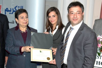 وتسلمت جائزة البنك السيدة راية سبيتاني، رئيس دائرة علاقات المستثمرين والجودة الشاملة، والسيد معاوية القواسمي مدير منطقة الجنوب في بنك فلسطين، وذلك بحضور رئيس لجنة المحكمين الدكتورة حنان عشراوي، ومجموعة من الشخصيات الاعتبارية والمؤسسات الاهلية وشركات من القطاع الخاص الفلسطيني ووفود أجنبية، اضافة الى عدد من مؤسسات الاعلام والصحافة والتلفزيون.