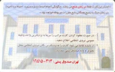يحمل وثيقة نهاية الخدمة (معافيت بايان خدمت) بشكل عاجل لغرض استبدالها بوثائق ذكية (الكترونية) لكن المفاجأة كانت بحجز عشرات الآلاف من تلك الوثائق فألغت وجمدت صلاحيتها (الأعمار بين 22 و35 عاماً) وعند اعتراض اصحابها ذكرتهم ادارات البسيج بشروط صلاحية الوثيقة في حالة السلم فقط وتعتبر باطلة في حالات (اللا سلم) او الحرب ! مما يثبت ما كشفته مصادر الاستخبارات للحرس الثوري عن ان القيادة العسكرية