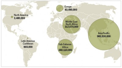 يأتي بعدهم كفار القارة السمراء، باستثناء مصر والسودان ودول شمال إفريقيا، ونسبتهم 2.4% من المجموع العام، يليهم 4% بأمريكا اللاتينية والكاريبي، وبعدهم 5.2% في الولايات المتحدة وكندا، ثم 12% في أوروبا، والباقي في آسيا وأوقيانيا، ونسبتهم 76.2% يمثلون أكثر من 858 مليونا، منهم 62.2% في الصين وحدها، أي تقريبا 586 مليونا ممن يولدون ويعيشون ويرحلون وكأن شيئاً لم يكن.