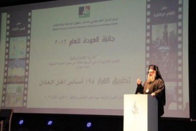 اقام المركز الفلسطيني لمصادر حقوق المواطنة واللاجئين "بديل" مساء اليوم في قاعة الندوة الدولية في بيت لحم امسية ثقافية فنية لتكريم الفائزين بجائزة العودة السنوية وقد ابتدأت الامسية بالنشيد الوطني الفلسطيني وكلمة ترحيبية لمركز بديل القتها مديرة المؤسسة السيدة نجوى درويش ,ثم كلمة سيادة المطران عطاالله حنا رئيس اساقفة سبسطية للروم الارثوذكس, تلا ذلك كلمة السيد