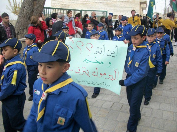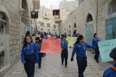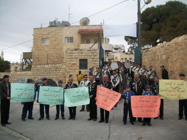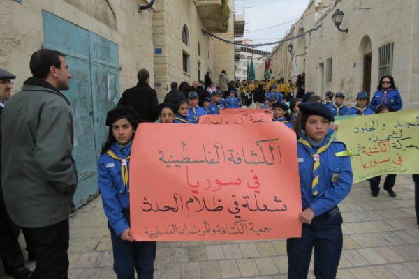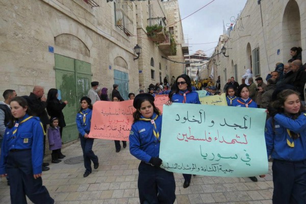 خلال مسيرة الميلاد وأمام العالم أجمع وعبر الفضائيات ووكالات الانباء العربية والعالمية نفذت جمعية الكشافة الفلسطينية ومفوضية بيت لحم ومجموعة كشافة دالاسال وقفة تضامنية مع كشافة فلسطين في سوريا وشعبنا العربي الفلسطيني في مخيمات الشتات وخاصة مخيم اليرموك، حيث جابت المجموعات الكشفية خلال استقبالها عدد من البطاركة شوارع بيت لحم حاملين شعارات وطنية للتضامن مع إخوتنا الفلسطينيين في سوريا ، وحملت قيادة الجمعية و اعضاء مفوضية محافظة بيت لحم اللافتات معبرين عن غضبهم وتضامنهم في هذه الوقفة التضامنية مع اهلنا وكشافينا في مخيم اليرموك .