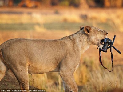 وحسب صحيفة الديلي ميل البريطانية وبدلاً من أن تقترب اللبؤة من الفريسة لتأكلها أصبحت مهتمة بالكاميرا، حتى أنها التقطتها من على الحامل الثلاثي، وسارت بها حول الحديقة الوطنية في زيمبابوي، وراحت تلتقط بها الصور لفريستها ولنفسها.