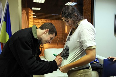 وفي السياق أخرجت احدى المجندات "تي شيرت" قديم تم تصميمه اثناء تواجد شاليط في "الأسر" لدعمه في حينها , وقام شاليط بالتوقيع عليه .