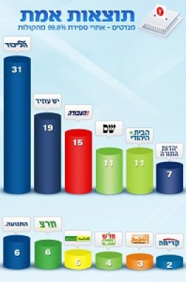 وبينت نتيجة فرز 99.8% من الأصوات أن قائمة "الليكود بيتينو" تحصل على 31 مقعدا، و"يش عتيد" تحصل على 19 مقعدا، و"العمل" 15 مقعدا، و"شاس" 11 مقعدا، و"البيت اليهودي" 11 مقعدا، و"يهدوت هتوراه" 7 مقاعد.