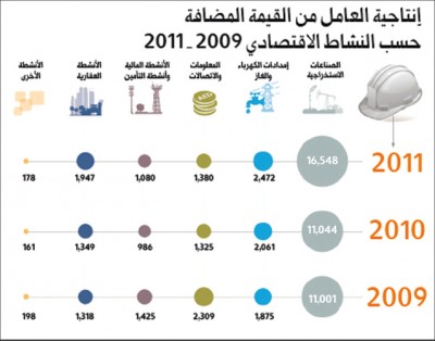 وأكد مركز "إحصاء أبوظبي" أن أنشطة التشييد احتلت المرتبة الأولى في نسبة مساهمتها في عدد العاملين لعامي 2010 و2011، حيث بلغ عدد العاملين في هذه الأنشطة نحو 587 ألفاً و617 ألف عامل على التوالي وبلغ أعلى متوسط لإنتاجية العامل من الإنتاج الاجمالي في أنشطة الصناعات الاستخراجية حيث بلغ 17 مليون درهم بنسبة ارتفاع 48.7%، تلتها أنشطة إمدادات الكهرباء والغاز حيث بلغت إنتاجية العامل فيها نحو 4 ملايين درهم، بينما بلغ أقل متوسط لإنتاجية العامل 270 ألف درهم في أنشطة أخرى متفرقة.
