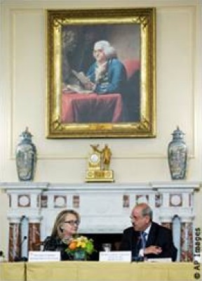 وزيرة الخارجية هيلاري رودام كلينتون والسفير محمد الحسيني الشريف مندوب جامعة الدول العربية في الولايات المتحدة يعلنان عن إطلاق مشروع الكتاب المفتوح في 28 كانون الثاني/يناير بمقر وزارة الخارجية الأميركية.