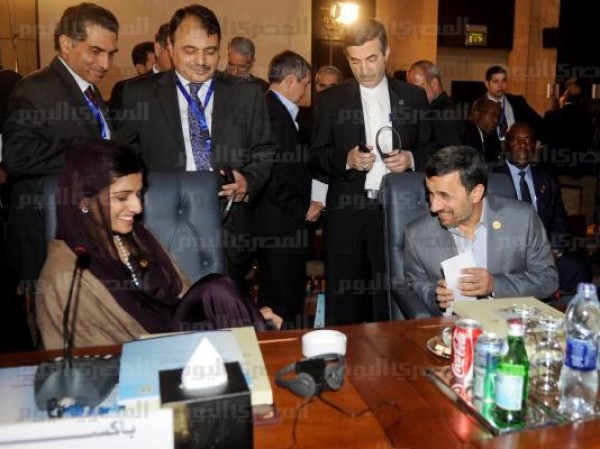 وتبادلت «حنا» بابتسامتها الهادئة الحديث مع الرئيس الإيراني أحمدي نجاد، ووزير خارجية البحرين، الشيخ خالد بن أحمد بن محمد آل خليفة، التي جلست بينهما داخل قاعة المؤتمر.