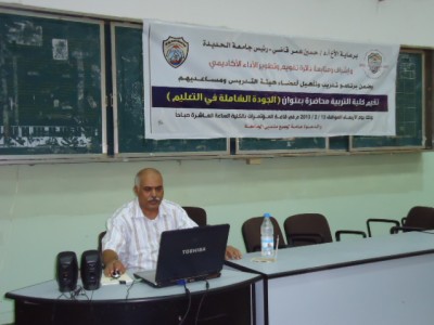 صيفان نائب عميد كلية التربية الحديدة للدراسات العليا حيث تناول عدد من المواضيع المتعلقة بالجودة ومفهوم الجودة الشاملة وثقافة الجودة ومراحل وخطوات تطور لجودة وأهداف وخصائص الجودة وعوامل نجاح ضمان الجودة وكيفية إدارة الجودة الشاملة في التعليم العالي وأهداف إدراتها وفوائدها على التعليم العالي وآليات تطبيقها ومتطلبات نجاح إدارة الجودة في التعليم الجامعي وخطوات تطبيق إدارة الجودة الشاملة