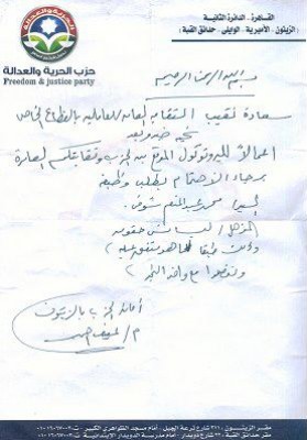 ففى خطاب موجه من حزب الحرية والعدالة الدائرة الثانية التى تشممل الزيتون والاميرية كشف خطاب موجه الى النقابة