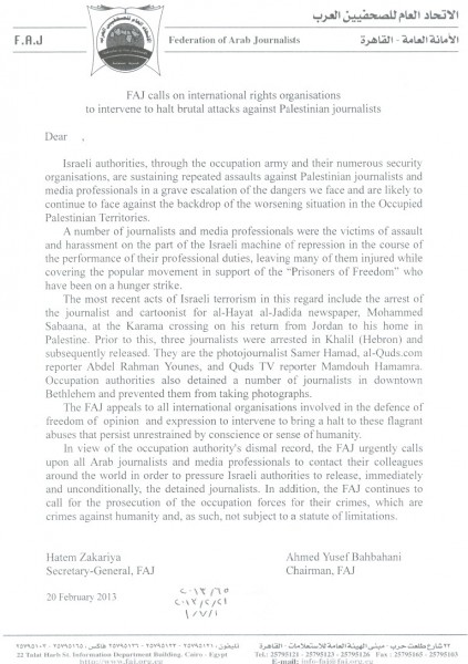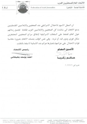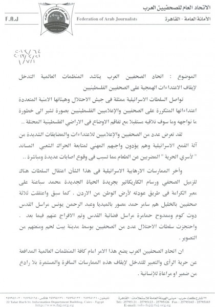 اتحاد الصحفيين العرب يناشد المنظمات العالمية التدخل لإيقاف الاعتداءات الإسرائيلية الهمجية على الصحفيين الفلسطينيين