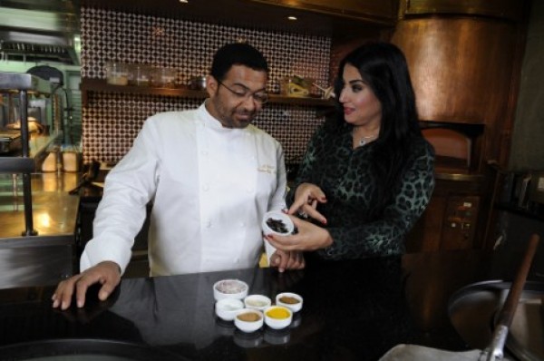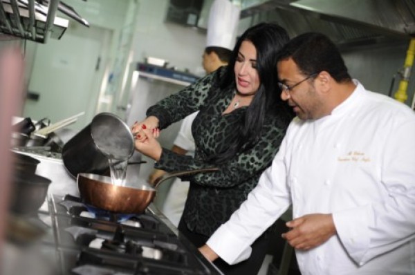 واغتنمت سمية الخشاب الفرصة لتذوق عدداً من الأطباق الإماراتية، ومنها "جشيد" سمك القرش بضيافة الشيف علي سالم البدواوي، الطاهي التنفيذي في "قصر الإمارات".
