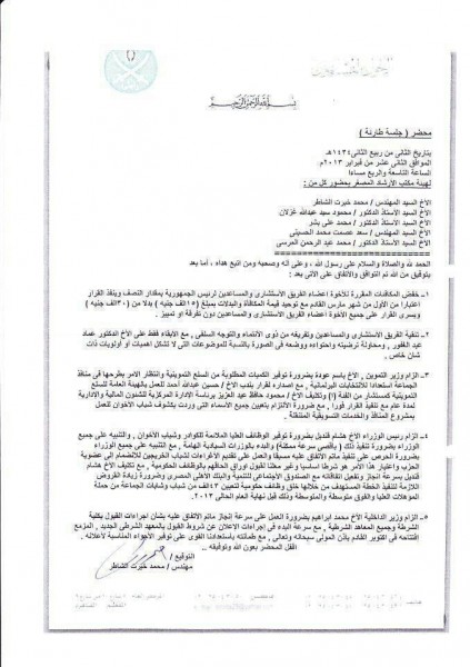 وجاء النبد الاخير ليحمل تنبيها على وزير الداخلية محمد ابراهيم بضرورة العمل على القبول بكلية الشرطه ومعاهد الامناء ، مع سرعه الاعلان عن القبول بمعاهد الشرطه وبخاصة المعهد المزمع افتتاحه فى اكتوبر القادم ، وانتهى المحضر بتوقيع