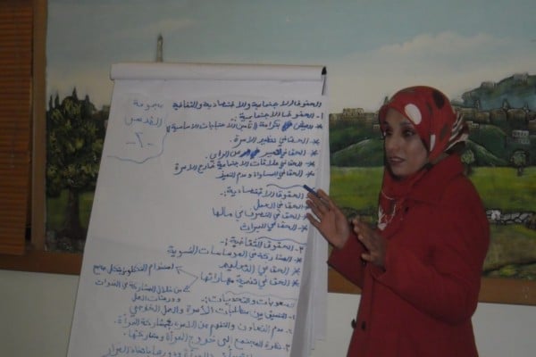 وفي الجزء الثاني من اليوم التدريبي والذي حمل عنوان المرأة الفلسطينية ( حقوق – المجتمع المحلي- المشاركة السياسية )، تم التطرق الى تاريخ نضال المرأة الفلسطينية والتعريف بمكانتها وانجازات الحركة النسوية الفلسطينية، وتم التركيز خلال اليوم التدريبي على الخلفية تاريخية وقانونية والحديث عن حقوق المرأة في المواثيق الدولية، وتم والتركيز على حق المراة في المشاركة السياسسية، وفي نهاية التدريب قسمت المشاركات الى قسمين ومن خلال التدريب العملي ابرزت المشاركات معوقات وصول المرأة في فلسطين الى مراكز صنع القرار.