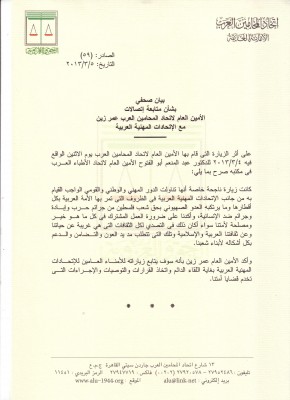 على أثر الزيارة التى قام بها الأمين العام لاتحاد المحامين العرب يوم الاثنين الواقع فيه 4/3/2013 للدكتور عبد المنعم أبو الفتوح الأمين العام لاتحاد الأطباء العرب فى مكتبه صرح بما يلي: