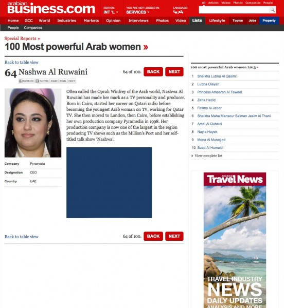 اختارت مجلة "أرابييان بيزنس" الإعلامية نشوة الرويني، الرئيس التنفيذي لشركة بيراميديا، ضمن قائمة أقوى مائة إمرأة عربية لعام 2013، ويأتي هذا الاختيار للمرة الثالثة على التوالي من قبل نفس المجلة حيث تم اختيارها سابقاً في يونيو الماضي ضمن قائمة أقوى 500 شخصية عربية مؤثرة في العالم، وكذلك في ديسمبر 2011 ضمن قائمة أقوى مائة سيدة عربية.