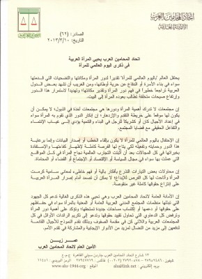 إن الأمانة العامة لاتحاد المحامين العرب وهي تحيي هذه الذكرى الغالية تدعم كل الجهود التي تبذلها منظمات المجتمع المدني العربية العامة أو المعنية بالمرأة سواء في حفاظهم على حقوقها أو دعمها أو إكتساب مساحات جديدة تستحقها؛ وتؤكد على أهمية دور المرأة وترفض كل الدعاوي التي تحاول تقييد حقوقها وتدعو إلى تكريم الرائدات الأوائل في كل المجتمعات العربية واللاتي كن في مقدمة الصفوف وبذلك نقدم النموذج للأجيال القادمة لدفعهن إلى مزيد من النضال لمزيد من الأدوار الإيجابية والمشاركة في تقدم الأمم.