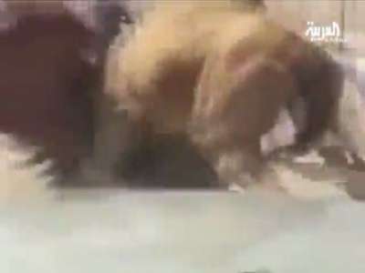 وعبثاً حاول هؤلاء، رغم استعمالهم العصيّ الخشبية، إلا أن الجملين واصلا العراك، وكأنهما آدميان، وبدا هناك إصرار قوي من الجانبين على عدم ترك مجال النصر لأي منهما.
