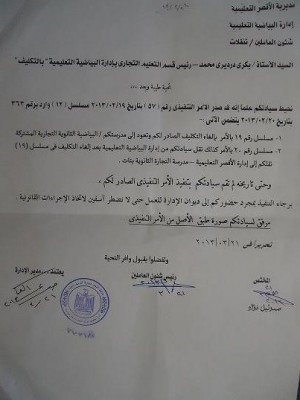 وارسل له خطاب من ادارة البياضية التعليمية على منزلة بتاريخ 25/3/2013 رغم ابلاغه مرضى يفيد صدور امر تنفيذى بالنقل التعسفى يؤكد بمجرد حضوره الى ديوان الادارة يتم تنفيذ النقل التعسفى دون قيد او شرط والتهديد بإتخاذ الاجراءات القانونية