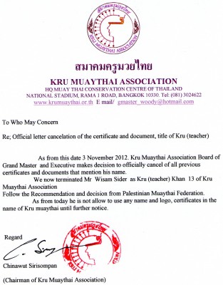 مع الإشارة أيضا إلى المدرب المذكور سبق فصله من الاتحاد الدولي للمواي تاي WMF وجمعية مدربين المواي تاي KMA في 8/11/2012 . هذا وسيستكمل اتحاد اللعبة بقية الإجراءات بهذا الخصوص .