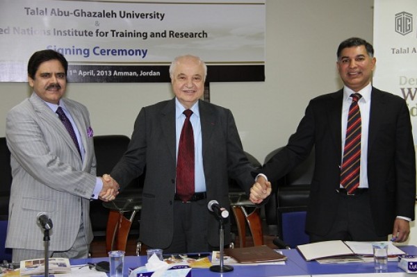 وقع الإتفاقية سعادة الدكتور طلال أبوغزاله، رئيس جامعة طلال أبوغزاله، والسيد بابار كمال، مدير برنامج العلوم المالية والتجارة العامة في معهد الأمم المتحدة للتدريب والبحوث بحضور سعادة السفير الهندي في الأردن السيد رادها رانجان داش، هذا وتمكن الإتفاقية جامعة طلال أبوغزاله من تقديم برامج بناء القدرات والمؤهلات المهنية التي يقدمها معهد الأمم المتحدة للتدريب والبحوث في مجالات العلوم المالية والتجارة والحوكمة العامة.
