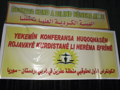 في مدرج مركز الثقافة والفنون بمدينة عفرين يوم الأحد 28/4/2013 الساعة العاشرة صباحاً ، وبناءً على دعوةٍ من لجنة تحضيرية مشتركة بين ( المجلس الوطني الكردي في سوريا ومجلس الشعب لغربي كردستان )/ عفرين ، وتحت شعار الهيئة الكردية العليا تمثلنا ، إنعقدالكونفرانس الأول لحقوقي منطقة عفرين ، حضره ما يقارب / 125 / حقوقياً ومحامياً ، وضيوف من شخصيات وطنية وممثلي أحزاب ومجالس كردية .