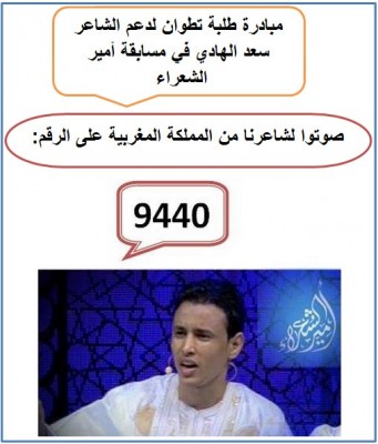 المغربية ، نتقدم بمبادرةٍ لدعم الشاعر سعد الهاد طالب الدراسات العليا بتطوان الذي يشارك الآن في مسابقة أمير الشعراء ، حيث كان من المشاركين في الأسبوع الأول من المسابقة ، وهو بحاجة إلي دعم كبير من طلبتنا في المملكة المغربية و في جميع أنحاء العالم بعدما تم منعه من الاستفادةِ من التصويتِ داخل وطنه الأم.