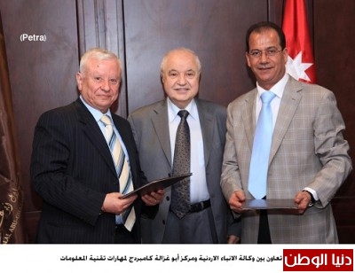 وقال الدكتور ابو غزالة خلال حفل التوقيع إن هذا البرنامج يمهد لمرحلة تعاون مهنية في مجال تقنية المعلومات بين مركز ابو غزالة كامبرج ووكالة الانباء الاردنية التي تعد مدرسة للاعلام الاردني وتشكل نموذجاً للمهنية وتقديم رسالة مهنية صادقة معرباً عن تطلعه لدخول مرحلة جديدة خاصة بعد التاهيل التقني على استعمال الكمبيوتر والانترنت ومنح المتدربين في الوكالة شهادة كامبردج التي تعد من اعرق الجامعات البريطانية .