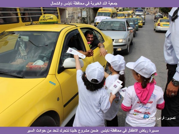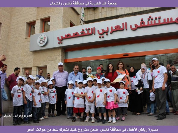 ضمن مشروع خلينا نتحرك للحد من حوادث السير ومكبات النفايات العشوائية الممول من الوكالة الأمريكية للتنمية الدولية (USAID)، وإشراف خدمات الإغاثة الكاثوليكية (CRS)، نظمت جمعية اللد الخيرية في محافظة نابلس وشمال الضفة الغربية بالتعاون مع شرطة محافظة نابلس ممثلة بالرائد رائد أبو غربية ونقابة رياض الأطفال ممثلة برئيس النقابة نعيم أبو زعرور ، مسيرة ميدانية ضمت 300 طفل وطفلة موزعين على 30 حافلة من مختلف رياض الأطفال،