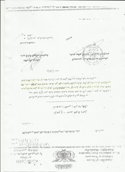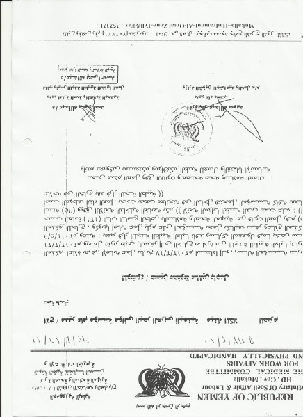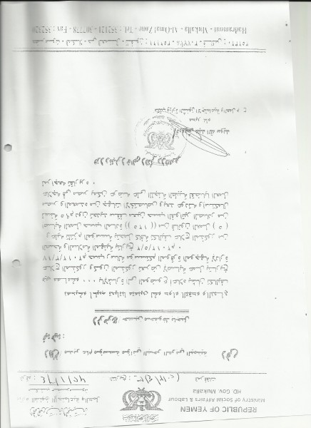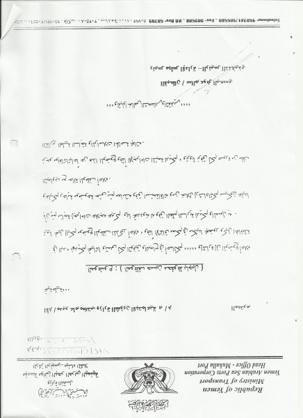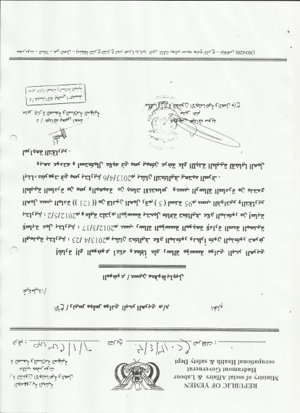 وقد خاطب مكتب الشئون الاجتماعية والعمل و إدارة الصحة والسلامة المهنية بتاريخ 30 ابريل 2013م بناءً على رسالة مؤسسة موانئ البحر العربي اليمنية بتاريخ 23 ابريل 2013م “للمرة الرابعة خلال العام ” بشان تكاليف علاج المذكور جاء فيها :