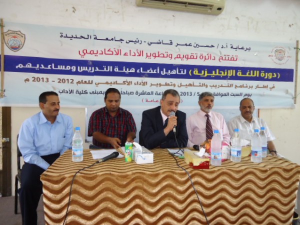 برعاية وحضور الأستاذ الدكتور / حسين عمر قاضي رئيس جامعة الحديدة أقيم اليوم بكلية الآداب حفل إفتتاح الدورة التدريبية في (اللغة الإنجليزية ) لأعضاء هيئة التدريس ومساعديهم التي تنظمها دائرة تقويم وتطوير الأداء الأكاديمي بجامعة الحديدة في إطار برنامج التدريب والتأهيل وتطوير الأداء الأكاديمي للعام الجامعي 2012/2013م.