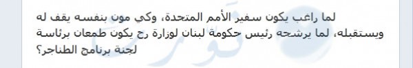 وأضاف:” لما راغب يكون سفير الأمم المتحدة، وكي مون بنفسه يقف له ويستقبله، لما يرشحه رئيس حكومة لبنان لوزارة رح يكون طمعان برئاسة لجنة برنامج الطناجر؟”.