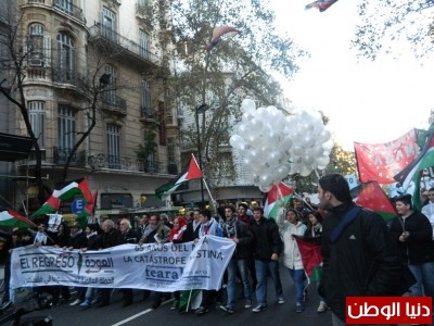 الموافق 15 أيار 2013 مظاهرة حاشدة أمام مقر سفارة إسرائيل، بمناسبة الذكرى الخامسة والستين لنكبة الشعب الفلسطيني، وذلك في إطار فعاليات التضامن والأنشطة الجماهيرية في الأرجنتين إحياءً لهذه الذكرى.