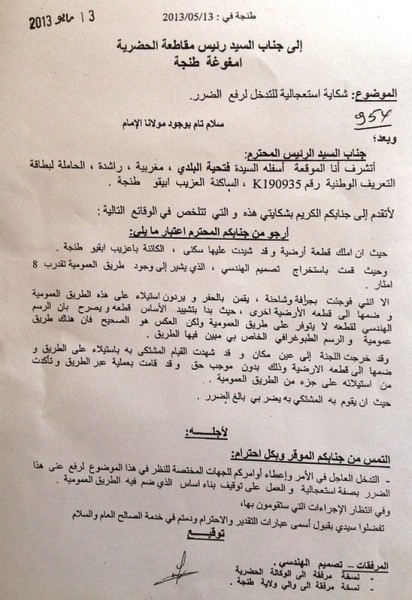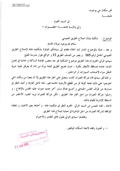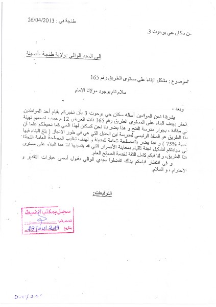 توصلت ادارة الموقع بنسخة من شكاية لساكنة حي بوحوت 3 المتواجدة بمقاطعة بني مكادة موجهة الى السيد الوالي بتاريخ 26 ابريل 2013 بخصوص البناء على اراضي مخصصة للطريق رقم 165 الواقعة بجوار مدرسة الفتح الابتدائية وتعتبر حسب شكاية الساكنة المنفذ الوحيد للولوج الى مدرسة ابن حنبل قيد الانشاء والتي وصلت الاشغال فيها الى نسبة 75% .