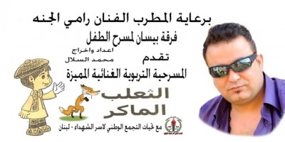 في لفتة انسانية للفنان المطرب رامي الجنة وفي اطار مساهمته الإنسانية للتخفيف عن النازحين الفلسطينين من مخيمات سوريا الى مخيم عين الحلوة وادخال البسمة على قلوبهم، وفي اطار دعمه للعمل الفني والابداعي سيرعى عرضا مسرحيا للاطفال تحت عنوان " الثعلب الماكر" والذي ستقدمه "فرقة بيسان لمسرح الطفل" التي يشرف عليها الفنان المخرج محمد السلال.