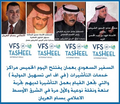 السفير السعودي بعمان يفتتح اليوم الخميس مراكز خدمات التأشيرات ( في اف اس تسهيل الدولية ) والتي تجعل القيام بعمل التأشيرة لديهم تجربة ممتعة ونقلة نوعية