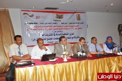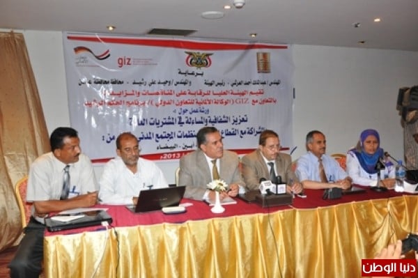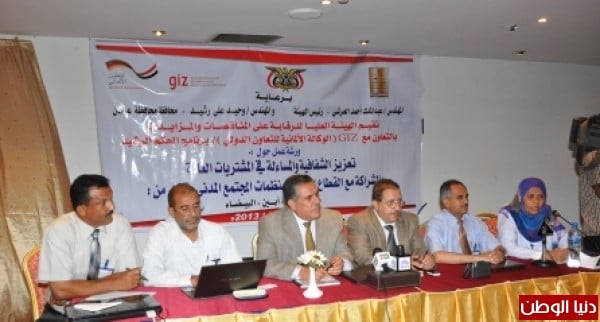 شهدت قاعة فندق كورال بمدينة عدن صباح اليوم الثلاثاء ورشة عمل حول "تعزيز الشفافية والمساءلة في المشتريات العامة " نظمتها الهيئة العليا للرقابة على المناقصات والمزايدات وبالتعاون مع الوكالة الألمانية للتعاون الدولي " GIZ " برنامج الحكم الرشيد وبالشراكة مع القطاع الخاص ومنظمات المجتمع المدني في كل من عدن – لحج – ابين – البيضاء وبمشاركة 50 سيد وسيدة يمثلون قطاعات مختلفة في المحافظات الأربع المستهدفة .