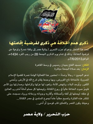 تحت شعار ذكرى هدم الخلافة هى ذكرى لفرضية اقامتها ..دعا حزب التحرير الاسلامى بولاية مصر الى وقفة نصرة وتوعية لفرضية اقامة الخلافة الاسلامية الجمعة 28 رجب بمسجد الفتح بميدان رمسيس بالقاهرة بعد صلاة الجمعة