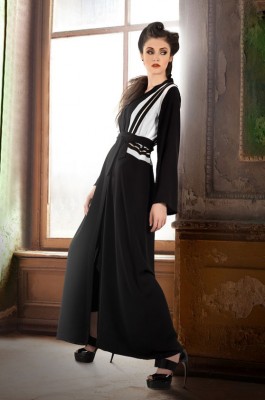 • أما العباية الأخيرة The City Print من مجموعة الأبيض والأسود، فهي أحد الخيارات الرائعة لسيدة عصرية.