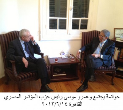 عقد نايف حواتمة الأمين العام للجبهة الديمقراطية لتحرير فلسطين جولة مباحثات مع د. عمرو موسى رئيس حزب المؤتمر المصري عضو قيادة جبهة الانقاذ الوطني.