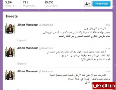 أضاف "منصور" عبر حسابها الشخصي على موقع تويتر، موجهة حديثها إلى السفيرة آن باترسون: "مصر دولة مستقلة ذات سيادة، ولقد انتهى عهد المندوب السامي البريطاني.. مدام باترسون.. تذكري أن الشعب المصري هو القائد والمعلم".