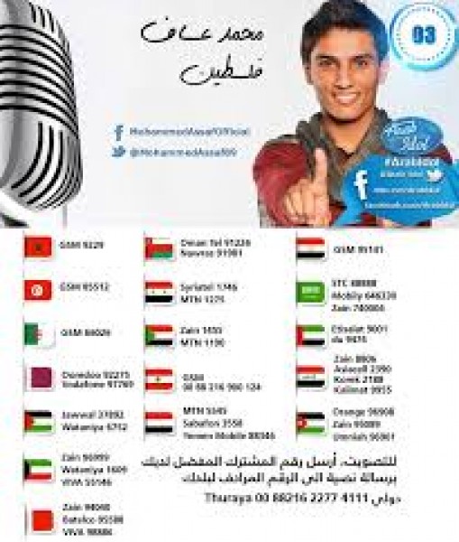 دنيا الوطن تدعوكم لتكثيف التصويت للفنان الفلسطيني محمد عساف بارسال رقم 3 على الارقام التالية
