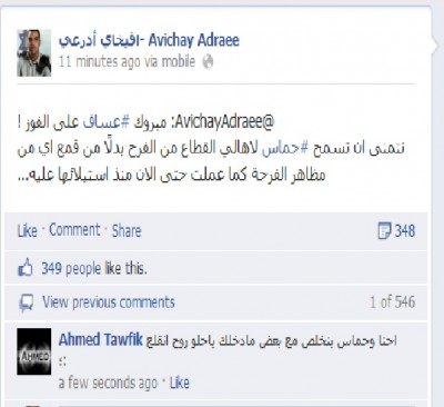 افيخاي ادرعي او مسماه اليوم "الأيدول أدرعي" الناطق الرسمي باسم الجيش الاسرائيلي وبعد تشجيعه لعساف، يهنئه بالفوز اليوم، مضيفا تمنياته بسماح حماس لاهالي القطاع من الفرح بدلًا من قمع اي من مظاهر الفرحة على حد وصف افيخاي ادرعي "الحرباة ".