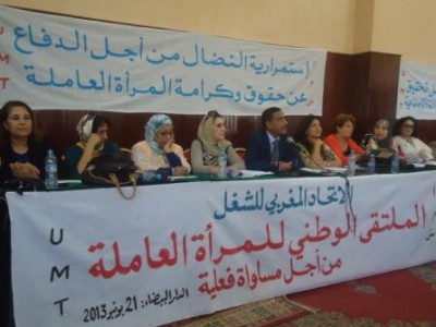 احتضن المقر المركزي للاتحاد المغربي للشغل بالدار البيضاء هذا اليوم 21 يونيو 2013 الملتقى الوطني للمرأة العاملة بالاتحاد في جو من المسؤولية كما تميز بكلمة الأمين العام الذي استحضر الدور الطلائعي التي تلعبه المرأة العاملة داخل الاتحاد مشيرا للاهتمام الخاص التي تحضى به لدى الأمانة الوطنية للإتحاد المغربي ،و قد قدمت الأخت أمال العمري عضوة الأمانة الوطنية للاتحاد المغربي للشغل عرضا دقيقا ومفصلا عن الوضعية الاقتصادية ،و الاجتماعية و السياسية للمرأة العاملة