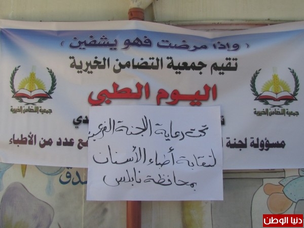 نظمت اللجنة الفرعية لنقابة طب الأسنان يوما طبيا مجانيا للأسنان بالتعاون مع عدد من أطباء المختصين لأبناء المجتمع المحلي في محافظة نابلس ، وذلك في المدرسة الإسلامية للإناث – رفيديا يوم الخميس الموافق 20/6/2013 حيث تم علاج ما يقارب 200 طفل وتم تحويلهم إلى العيادات الخاصة لأطباء الأسنان