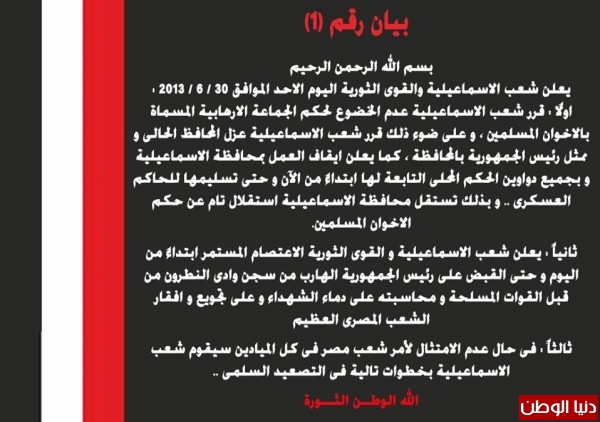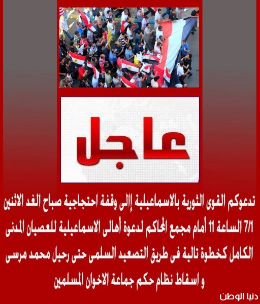 رصد المجلس المصرى الدولى لحقوق الانسان خمسون الف من شعب الاسماعيلية يطالبون القوات المسلحة بالقبض على "د.محمد مرسى" الهارب وقال تامرخالد المنسق العام للمجلس انه عقب صلاة العصر وصلت مسيرات الإسماعيلية إلى ميدان الممر-الشهداء من خلال اربع مسيرات من داخل المدينة وسبع وفود من المراكز والقرى في مشهد حاشد ضم أكثر من 20 ألف متظاهر للمطالبة برحيل الرئيس محمد مرسي وإجراء انتخابات رئاسية مبكرة